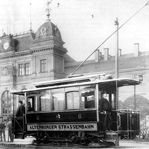 Aufnahme des elektrischen Straßenbahnbetriebs mit sieben Triebwagen. Die eingleisige Strecke mit fünf Ausweichen ist 3,5 km lang.